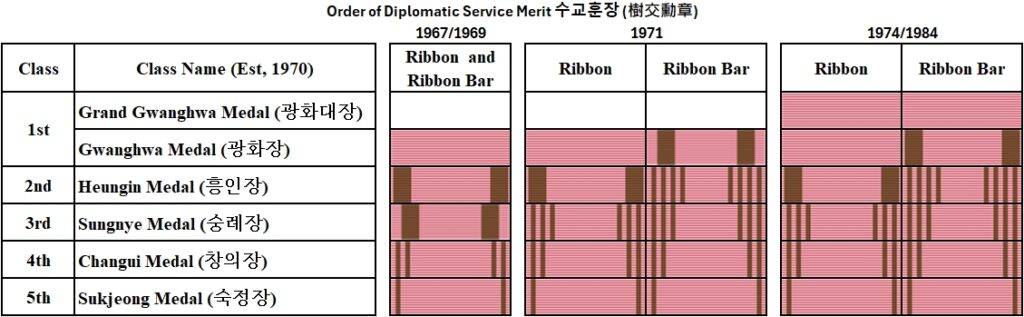 Presidential Decree #5688 was issued on June 30, 1971. Much of the legislation is identical to the 1967 series. There were several changes to the ribbons and stripes. The base color for the ribbons is still described as rose pink, but the smaller stripes are now described as orange 등색 (燈色). All five classes have a 38 × 10 mm ribbon bar and a 12 × 8 mm lapel pin.