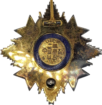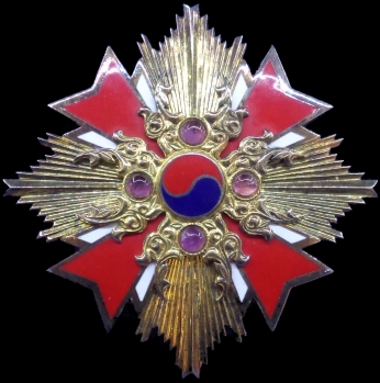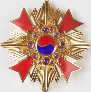On Oct. 23, 1974, under Presidential Decree #7289, the first class of the Order, the Gwanghwa Class, was split into two grades. The new grade of the first class was named the Grand Gwanghwa. This new 1st Grade of the 1st Class can be readily identified by the 8 purple cabochons around the centers of the pendant and breast star. There are no changes to the remaining classes.