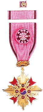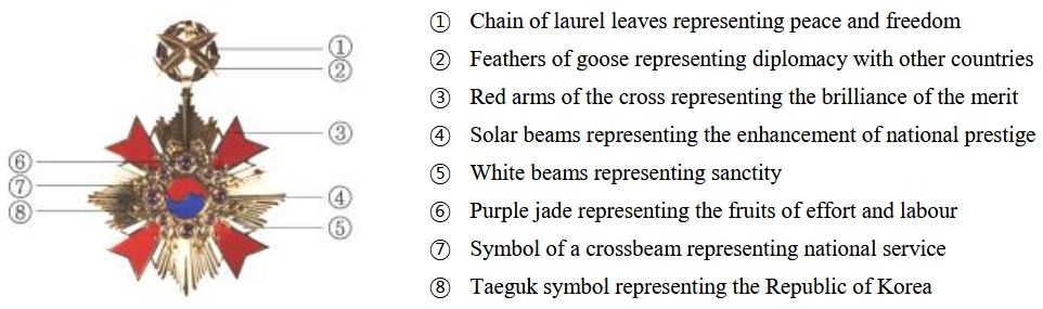 The laurel crown on the suspension device means peace and freedom, while the goose feathers, which are also on the suspension, indicate a linkage with foreign countries. The red wings of the cross indicate the four directions as well as the brilliance of the work. The sun’s rays symbolize the heightened dignity of the country. The smaller white wings indicate holiness. The purple pearls indicate the fruitage of the hard work. The intricate design around the pearls, the Dangchomoon, indicates the wood supporting the girder, symbolizing the supporting of the country. And the Taeguk at the center symbolizes the Republic of Korea. The rose pink, light red (scarlet) color found on the ribbons symbolizes mental combative spirit, while the brown color indicates majesty.