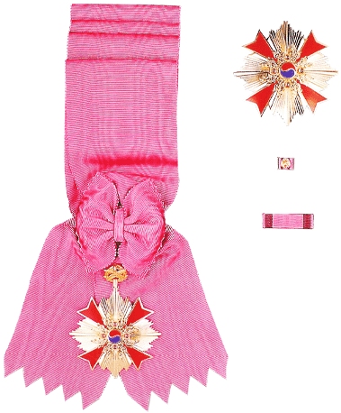 •  1st Class (sized) for Ladies: The pendant has a 45 mm diameter and is suspended from a 70 × 1,700 mm sash. The sash is a solid pink color, 담홍색 (淡紅色). The breast star has a diameter of 50 mm. The ribbon bar and lapel pin are identical to the men’s size.