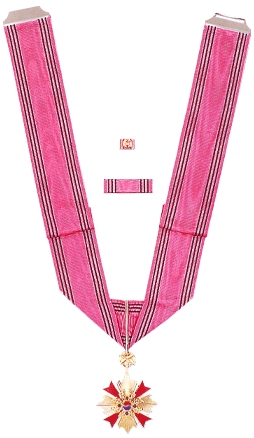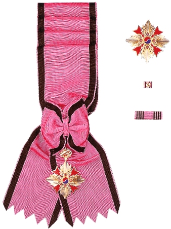 • 3rd Class: The pendant has a 50 mm diameter and is suspended from a 36 mm x 600 mm cravat. The cravat has two 5 mm brown/dark brown stripes, one on each side of the 20 mm pink center stripe. There is no breast star. The ribbon bar is 36 × 10 mm, and the colors and widths match the cravat. There is a 1.7 cm lapel pin.