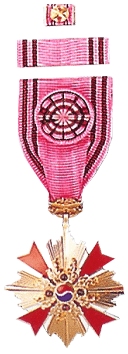• 2nd Class (sized) for Ladies: The pendant has a 43 mm diameter and is suspended from a 70 × 1,700 mm sash. The sash is a pink color 담홍색 (淡紅色) and should have 7 mm brown stripes, one on each side, but there is no mention of stripes in the legislation. The breast star has a diameter of 45 mm. The ribbon bar and lapel pin are identical to the men’s size.