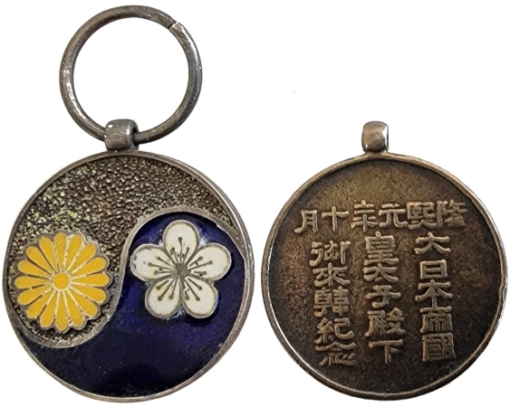The Hirohito commemoration medal was designed by Nakano Sozan 中野双山 (1881-1940). It has the Osaka Mint hallmark on the edge. It came in 4 variations: bronze and silver table medals and silver and gold watch fobs. For more information on this 1921 commemorative medal and other medals associated with Hirohito’s visit to Europe, see the Medals of Asia website.