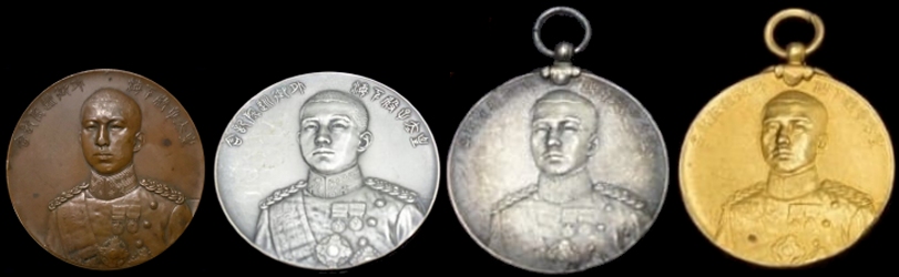 The Japanese medal is exceedingly rare, but the Korean medal is far rarer. One unsubstantiated source states that there were 27 made in silver and 10 in white gold 백금.7 The only thing I can offer is a picture of the medal and a translation of the text on the reverse side. The top line is 隆熙元年十月 Yunghui 1st year 10 month (October 1907) 융희원년십월, and the three columns are 大日本帝國皇太子殿下御來韓紀念 Commemorating the visit of the Imperial Prince of Japan to Korea 대일본제국황태자전하어내한기념. Link to the blog post and picture source. Another blog post, picture source, same owner.8