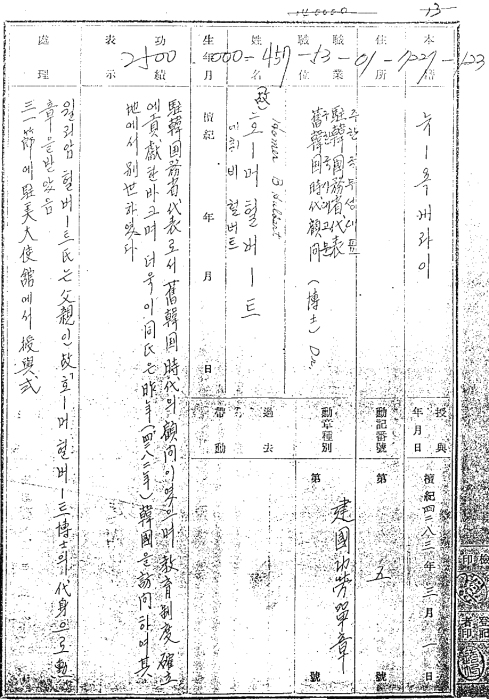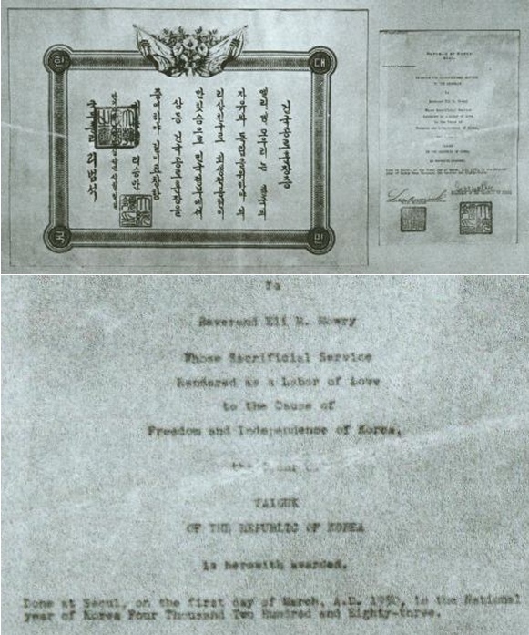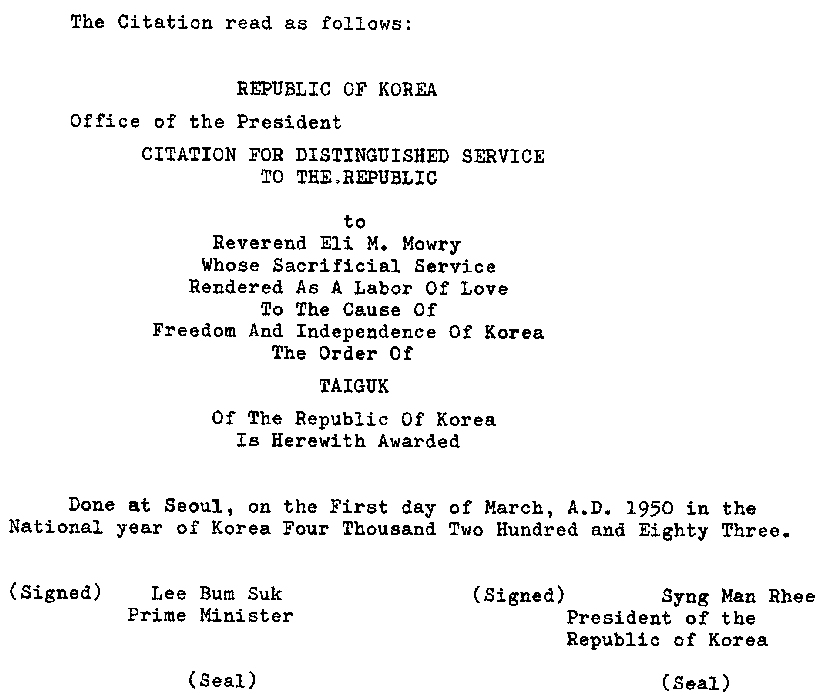 Korean sources indicate that during the 12 years of Rhee Syngman’s rule, a total of 22 foreigners, including the 10 foreigners mentioned above, were awarded the Order of National Foundation. I have been unable to confirm this. There is an additional note of interest in regard to Dr. Mowry. In 1968, Dr. Mowry was re-awarded the Order of National Foundation, 3rd Class, by President Park Chung-hee. Also in 1968, the Korean government re-awarded Mr. Bethell with the Order of National Foundation, 3rd class.2